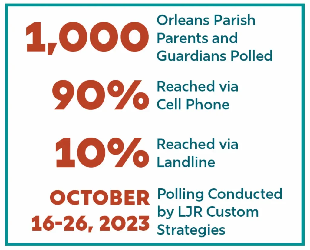 For this poll, LJR surveyed 1,000 adults who reside in Orleans Parish and are the parent / guardian / responsible party for one or more children who currently reside in their household and attend a K-12 school or are homeschooled. The poll was conducted from October 16-26, 2023, via landline and cell phone, with 90% of respondents reached by cell phone and 10% reached by landline. Findings applying to the 1,000 person sample are subject to a sampling error of plus or minus 3.1%; subgroups of the sample are subject to error of up to plus or minus 10%. Please note that when percentages in responses do not add up to 100%, it’s due to rounding.