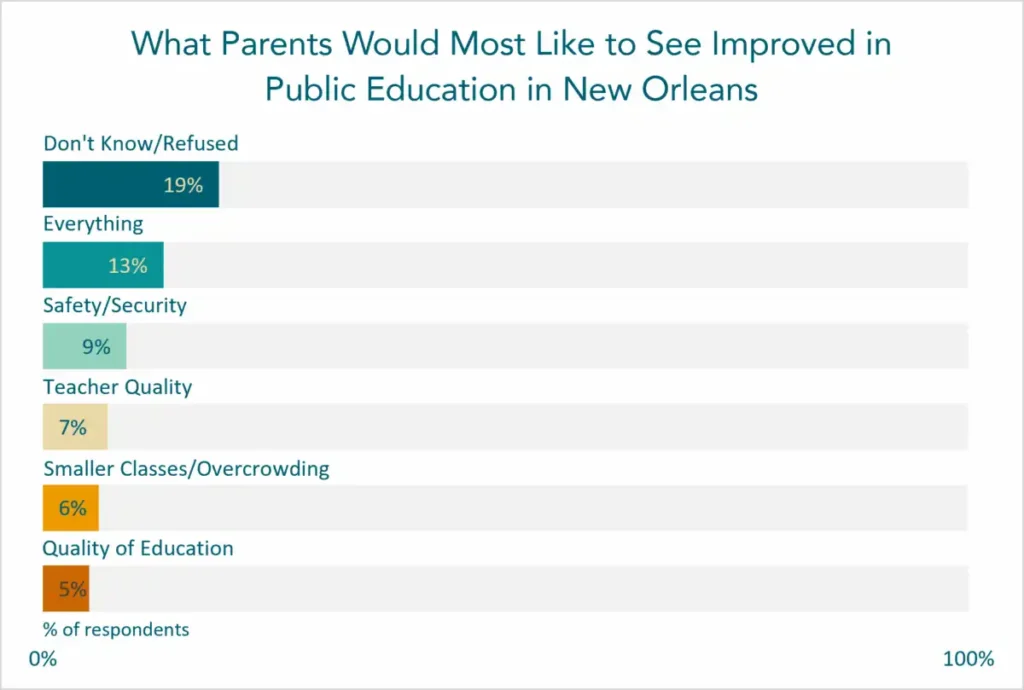 We also asked NOLA-PS parents and guardians what was the most important thing they believed should be improved about public education in New Orleans. Notably, 81% of respondents provided a suggestion (19% did not provide an answer or refused to do so). The most common answer, given by 13% of respondents, was “Everything”, followed by safety/security (9%), teacher quality (7%), smaller classes/reducing overcrowding (6%), and the overall quality of education (5%).