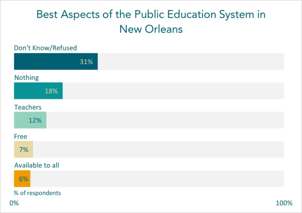 For the first time, this year, we asked NOLA-PS parents and guardians to tell what they believed was the best thing about public education in the city (this was a free response question). 31% of respondents did not provide an answer or refused to do so. For those who did respond, negative perceptions were once again apparent, as “Nothing” was stated by 18% of respondents. “Teachers” (12%), “Free” (7%), and “Available to all” (6%) were the next three most common answers.